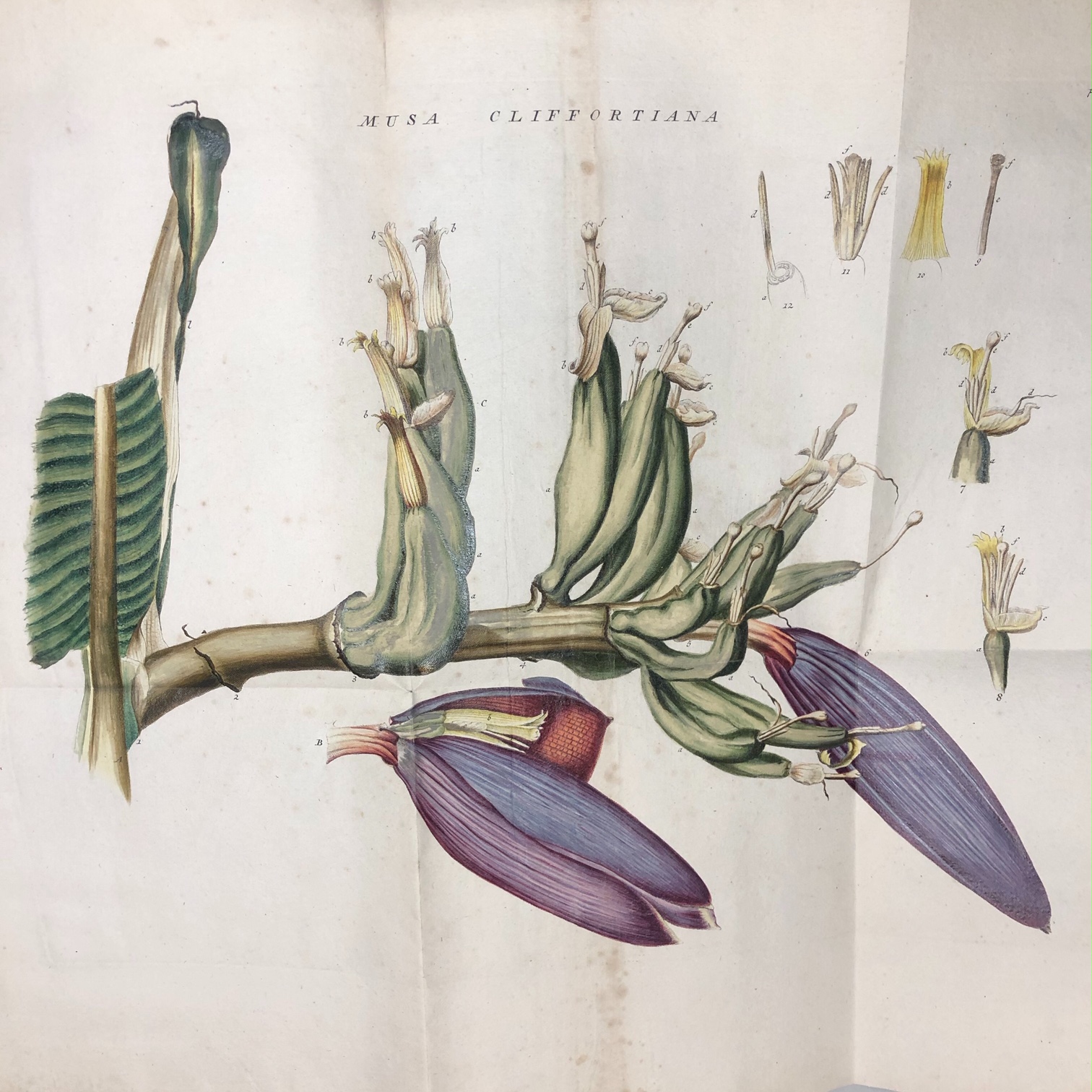 Deze botanische illustratie verbeeldt de bloeiwijze van de eerste bananenboom … lees verder